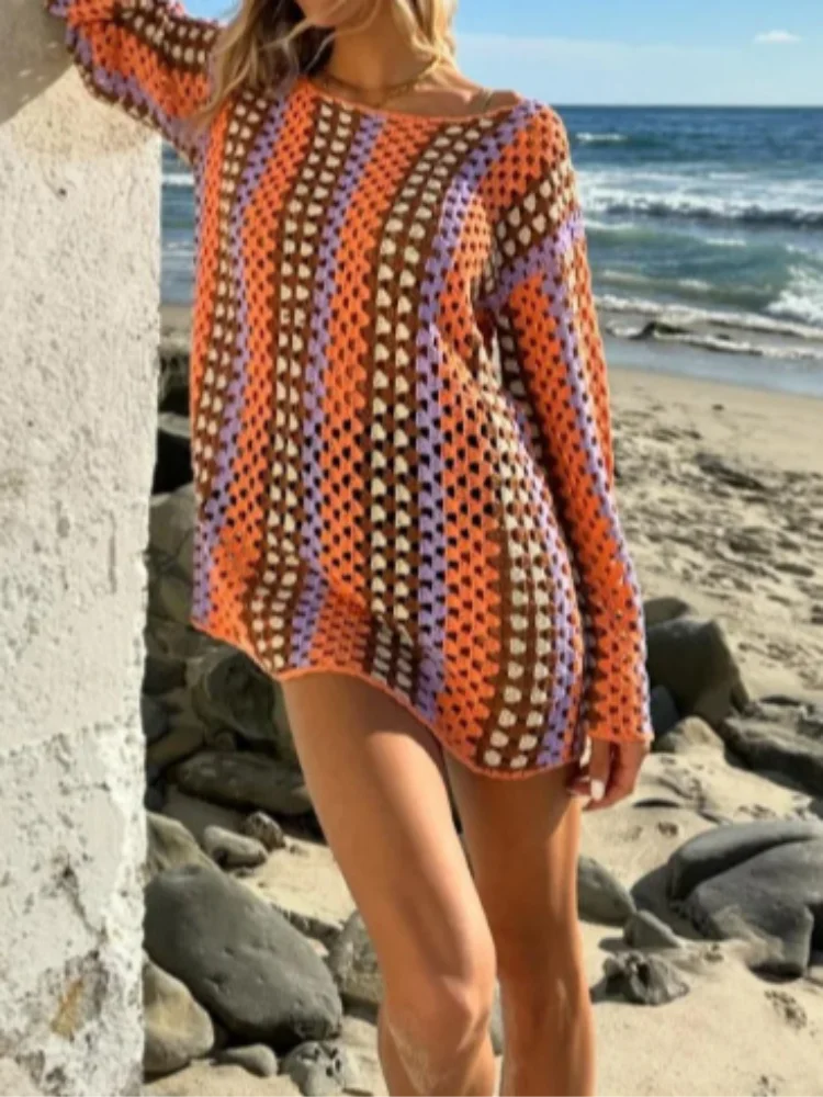Crochet Colorful Stripe Mini Dress O Neck Long Sleeve Knitted Dresses Bohemian Fashion Beach Vestidos New Lady Vacation Clothing